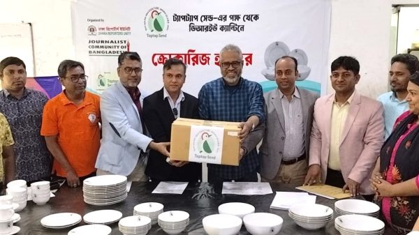 জার্নালিস্ট কমিউনিটি অব বাংলাদেশ এর উদ্যোগে বিদেশ থেকে টাকা পাঠানোর অ্যাপ ‘ট্যাপট্যাপ সেন্ড’ এর পক্ষ থেকে ঢাকা রিপোর্টার্স ইউনিটির (ডিআরইউ) ক্যান্টিনে ক্রোকারিজ সামগ্রী উপহার দেয়া হয়েছে। আজ সোমবার (১৭ ফেব্রুয়ারি)