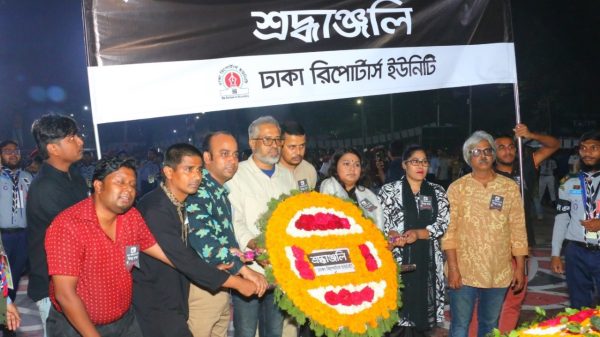 ঢাকা: অমর একুশে ফেব্রুয়ারির প্রথম প্রহরে কেন্দ্রীয় শহীদ মিনারে ভাষা শহীদদের প্রতি শ্রদ্ধা জানিয়েছে ঢাকা রিপোর্টার্স ইউনিটি (ডিআরইউ)। সভাপতি আবু সালেহ আকন ও সাধারণ সম্পাদক মাইনুল হাসান সোহেল এর নেতৃত্বে