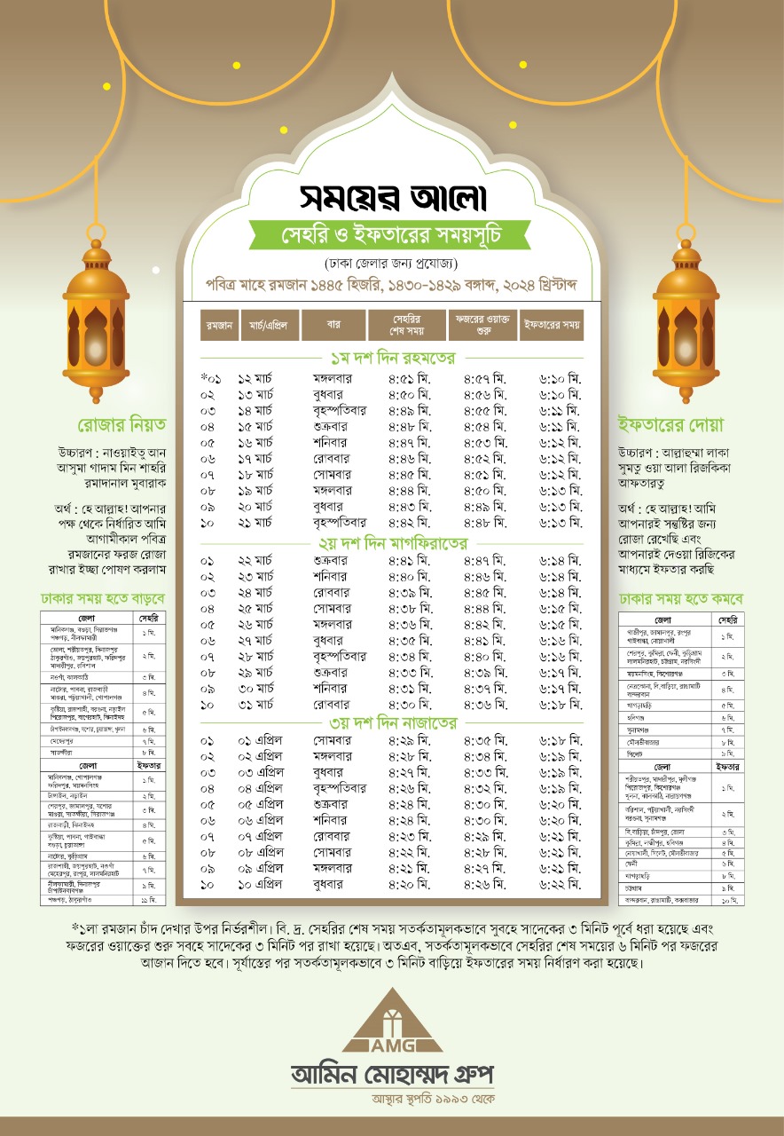 ইসলামিক ফাউন্ডেশন আরও জানায়, দূরত্ব অনুযায়ী ঢাকার সময়ের সঙ্গে সর্বোচ্চ ৯ মিনিট যোগ করে অথবা ৯ মিনিট বিয়োগ করে দেশের বিভিন্ন অঞ্চলের মানুষ সাহ্রি ও ইফতার করবেন।