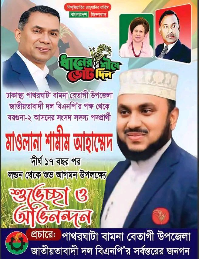 লন্ডনে দীর্ঘ ১৭ বছরের নির্বাসিত জীবন শেষে আজ শুক্রবার ১৭ অক্টোবর বাংলাদেশে ফিরলেন কেন্দ্রীয় ওলামা দলের সাবেক যুগ্ম-আহ্বায়ক, বরগুনা জেলা বিএনপির সাবেক যুগ্ম-সাধারণ সম্পাদক, যুক্তরাজ্য ছাত্রদলের সাবেক সহ-সভাপতি, কেন্দ্রীয় ওলামা দলের আহ্বায়ক সদস্য, বরগুনা-২ আসনে বিএনপির মনোনয়ন প্রত্যাশী, বিএনপির ভারপ্রাপ্ত চেয়ারম্যানের অত্যন্ত স্নেহভাজন, মাওলানা শামীম আহমেদ।