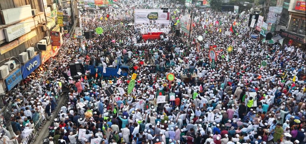 বাংলাদেশ জামায়াতে ইসলামীর সেক্রেটারি জেনারেল সাবেক এমপি মিয়া গোলাম পরওয়ার বলেন, আজকের সমাবেশ বাংলাদেশের মুসলিম উম্মাহকে ঐক্যের বার্তা দিচ্ছে। এই ঐক্য বজায় রেখে গণমানুষের ৫ দফা দাবি আদায় করা হবে। তিনি বলেন, বাংলাদেশের সকল সংবিধান বিশেষজ্ঞ একমত জাতীয় নির্বাচনের আগে গণভোট হতে আইনগত বাঁধা নেই। জাতীয় নির্বাচনের দিন গণভোট হতে পারলে নভেম্বরে বা জাতীয় নির্বাচনের দিনের আগে কেন গণভোট সম্ভব নয় প্রশ্ন রেখে তিনি বলেন, জুলাই সনদ বাস্তবায়ন ব্যতীত কীভাবে ত্রয়োদশ জাতীয় নির্বাচন সম্ভব হবে জাতির সামনে সেটি স্পষ্ট করতে তিনি অন্তর্বর্তীকালীন সরকারের প্রতি আহ্বান জানিয়ে বলেন, জুলাই সনদ বাস্তবায়ন ব্যতীত কোনোভাবেই ২০২৬ সালের ফেব্রুয়ারিতে নির্বাচন সংবিধান সম্মত হবে না।